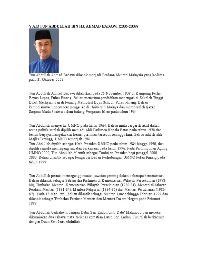 Biodata Of Tun Abdullah Ahmad Badawi Edited By Hasmy Agam Abdullah Ahmad Badawi Minister Of Studocu