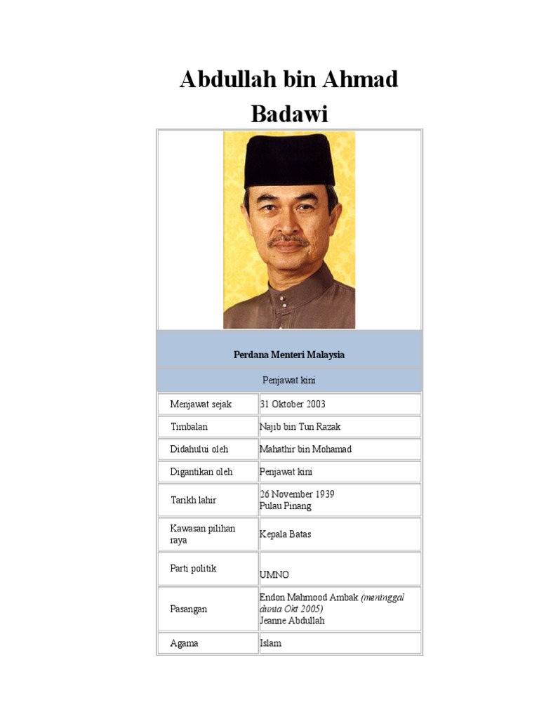 Yang Amat Berhormat Datuk Seri Utama Tun Abdullah bin Haji Ahmad Badawi lahir. BIODATA TUN ABDULLAH BIN HAJI AHMAD BADAWI Nama. Diplomatic profile series.