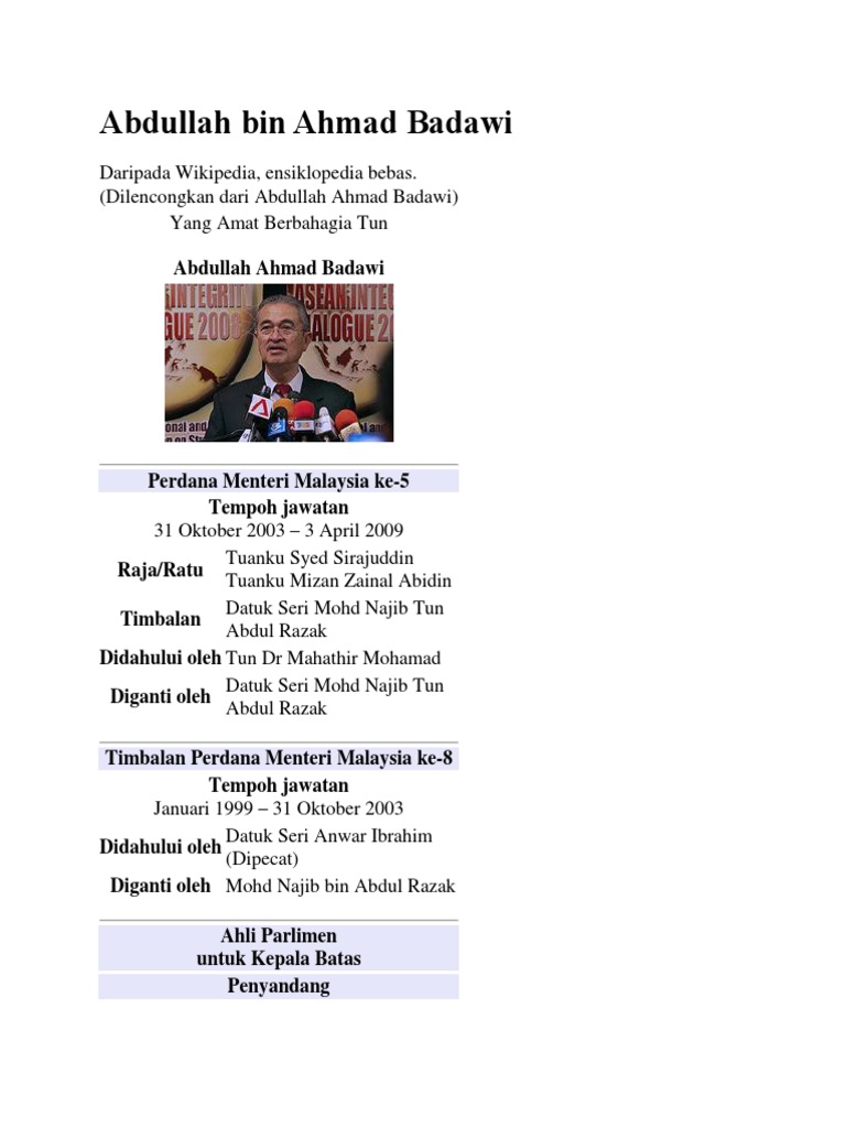 Welcoming tun dato sri abdullah ahmad badawi as our new patron and the. Abdullah Ahmad Badawi is a Malaysian politician who served as prime minister of Malaysia from 2003 to 2009. Abdullah succeeded Mahathir Mohamad in 2003 rising from the position of deputy prime minister.